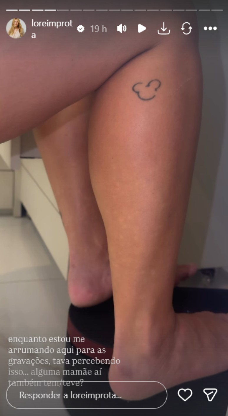 Nos stories, Lore mostrou as manchas e comentou sobre a situação. Segundo ela, as marcas surgiram de forma gradual e chamaram atenção.