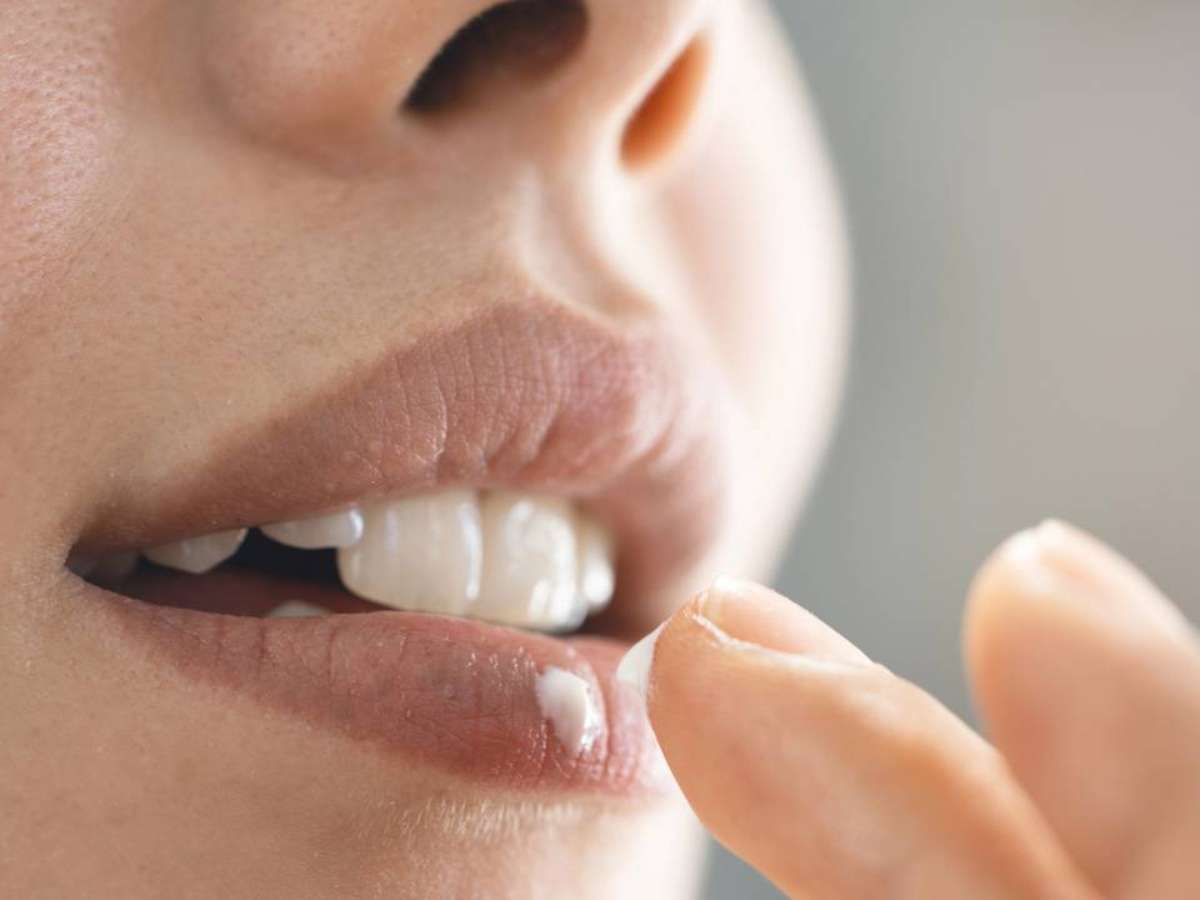 - Espalhar o balm ou a manteiga de cacau em toda a superfície, incluindo os cantos da boca.