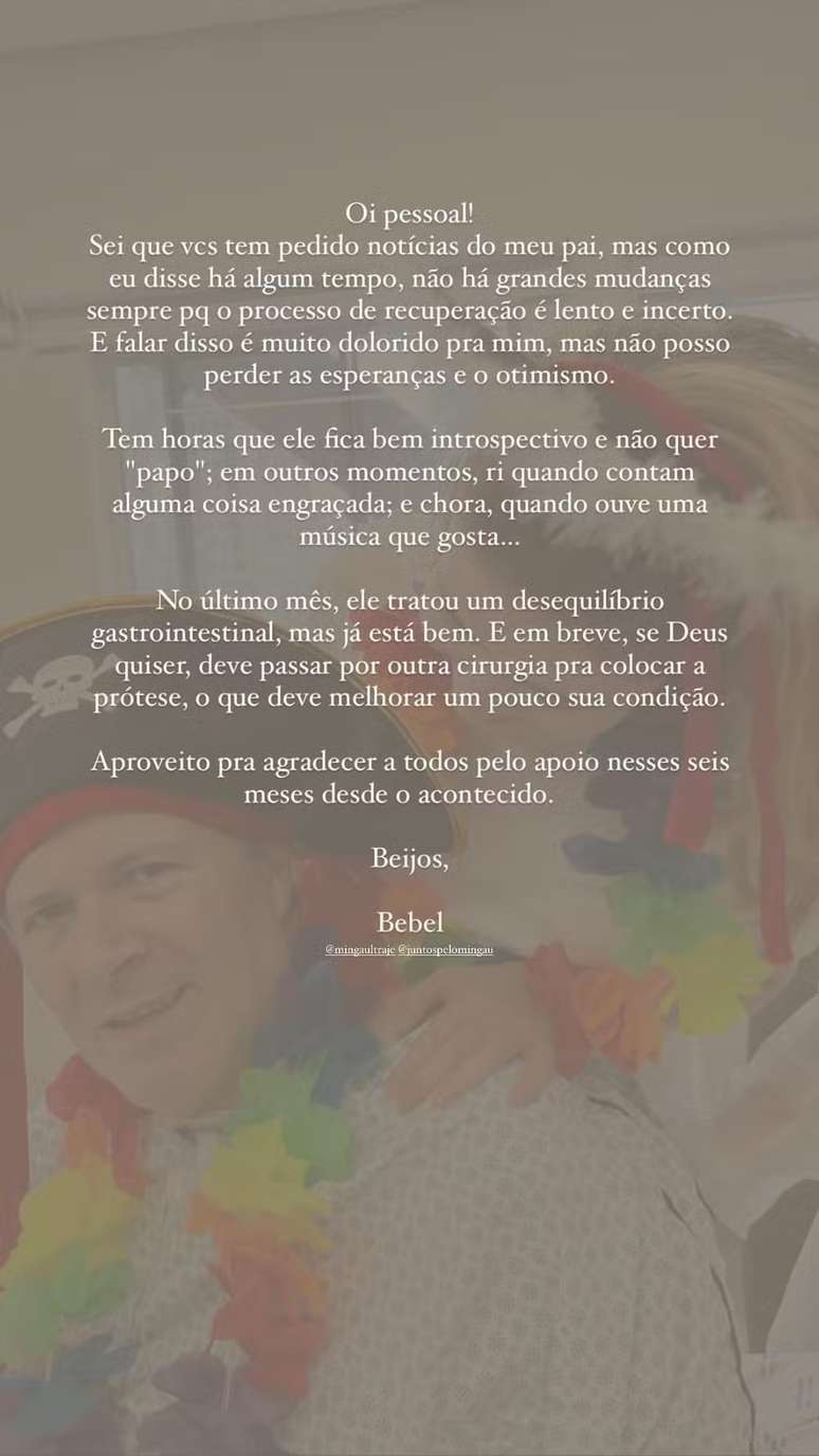 A filha de Mingau também comentou brevemente sobre o recente quadro infeccioso do pai e anunciou uma possível nova cirurgia: "No último mês, ele tratou um desequilíbrio gastrointestinal, mas já está bem. E em breve, se Deus quiser, deve passar por outra cirurgia para colocar a prótese, o que deve melhorar um pouco sua condição. Aproveito para agradecer a todos pelo apoio nesses seis meses desde o acontecido. Beijos, Bebel", finalizou.