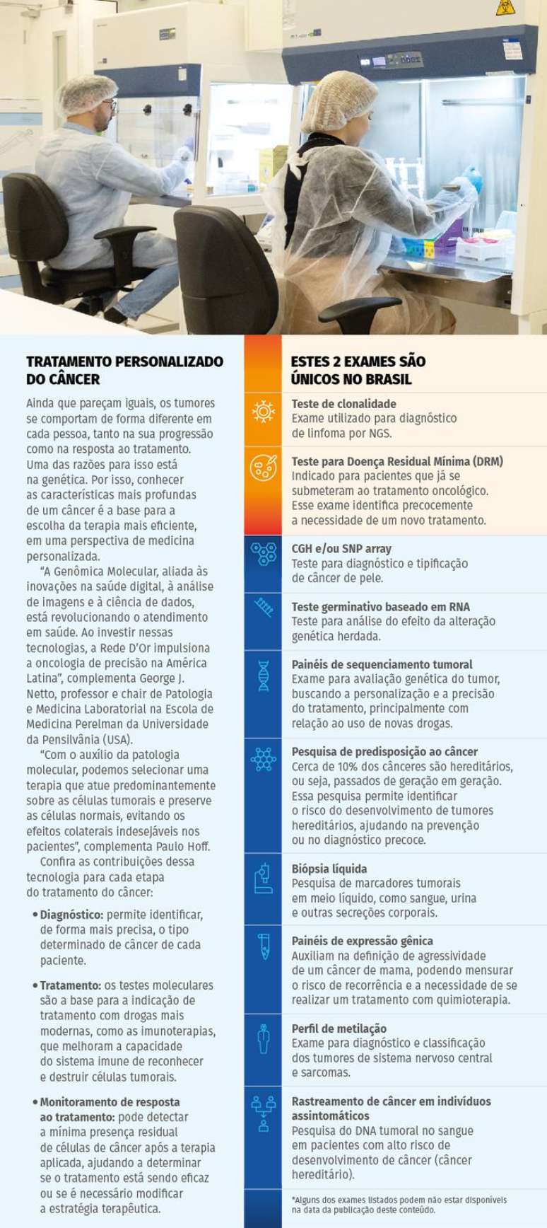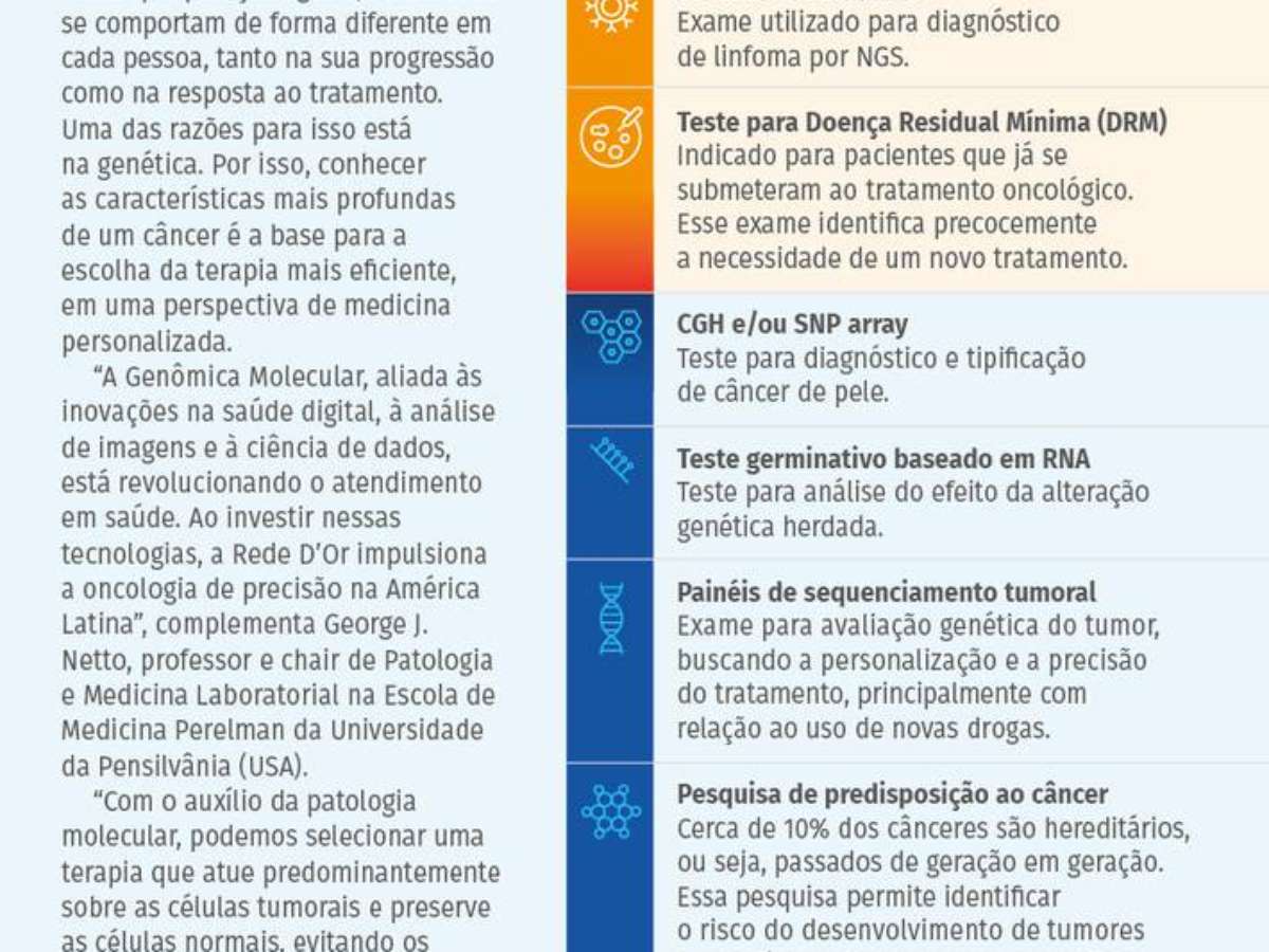 "Com resultados mais rápidos, os tratamentos são iniciados mais precocemente, melhorando ainda mais as chances de cura. Agora estamos prontos para oferecer uma seleção cada vez mais personalizada dos melhores tratamentos aos nossos pacientes", afi rma Paulo Hoff, presidente da Oncologia D'Or e pesquisador do IDOR na área de oncologia.