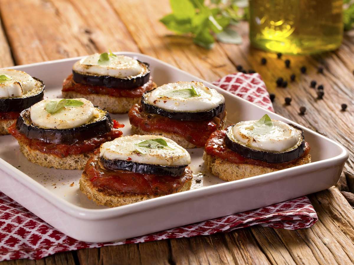 Passe um pouco de molho de tomate sobre cada fatia de pão, adicione uma fatia de berinjela e acrescente a muçarela de búfala.