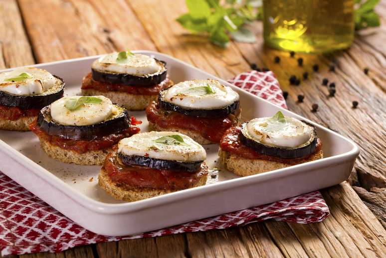 Unte uma assadeira antiaderente com o azeite e posicione as fatias do pão. Leve para assar em forno pré-aquecido a 160ºC, por cinco minutos, o suficiente para o pão ficar crocante, mas sem dourar. Retire a assadeira do forno e eleve a temperatura para 190ºC. Enquanto isso, grelhe as rodelas de berinjela em uma frigideira antiaderente e reserve.