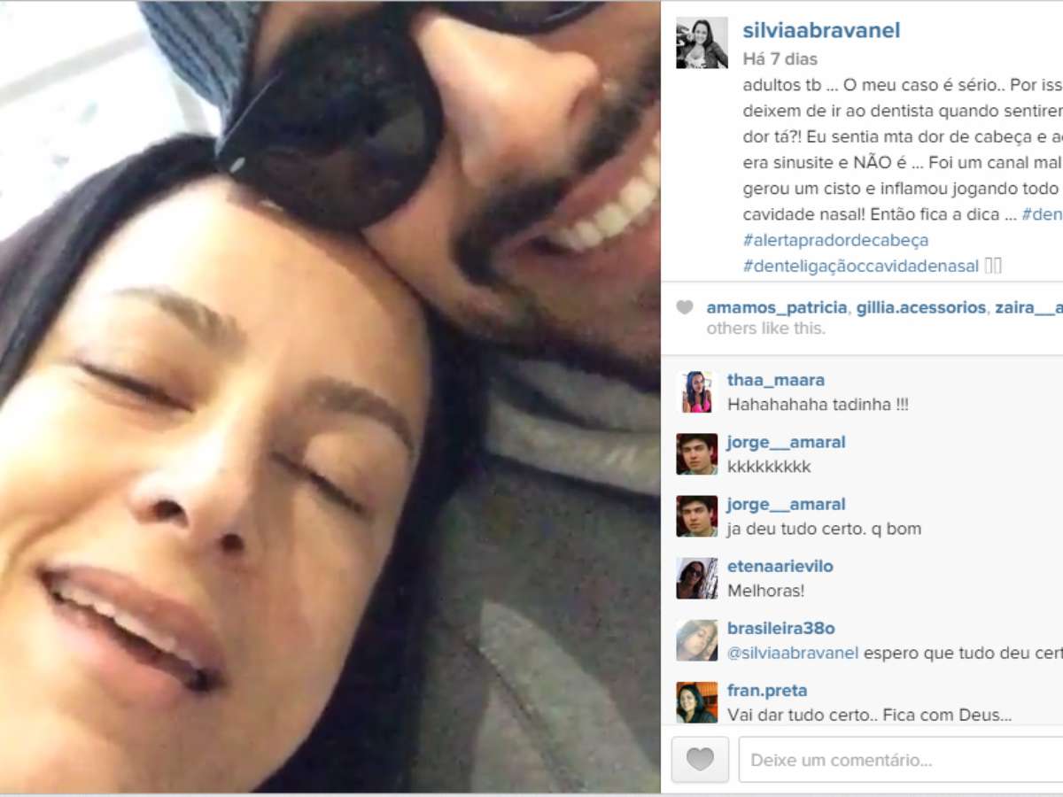 “Torçam por mim, isso ajuda a aliviar o medo. O meu caso é sério. Por isso, não deixem de ir ao dentista quando sentirem qualquer tipo de dor, tá?! Eu sentia muita dor de cabeça e achava que era sinusite, mas não é. Foi um canal mal feito que gerou um cisto e inflamou, jogando todo o líquido para a cavidade nasal", escreveu Silvia em sua página do Instagram no início de abril.