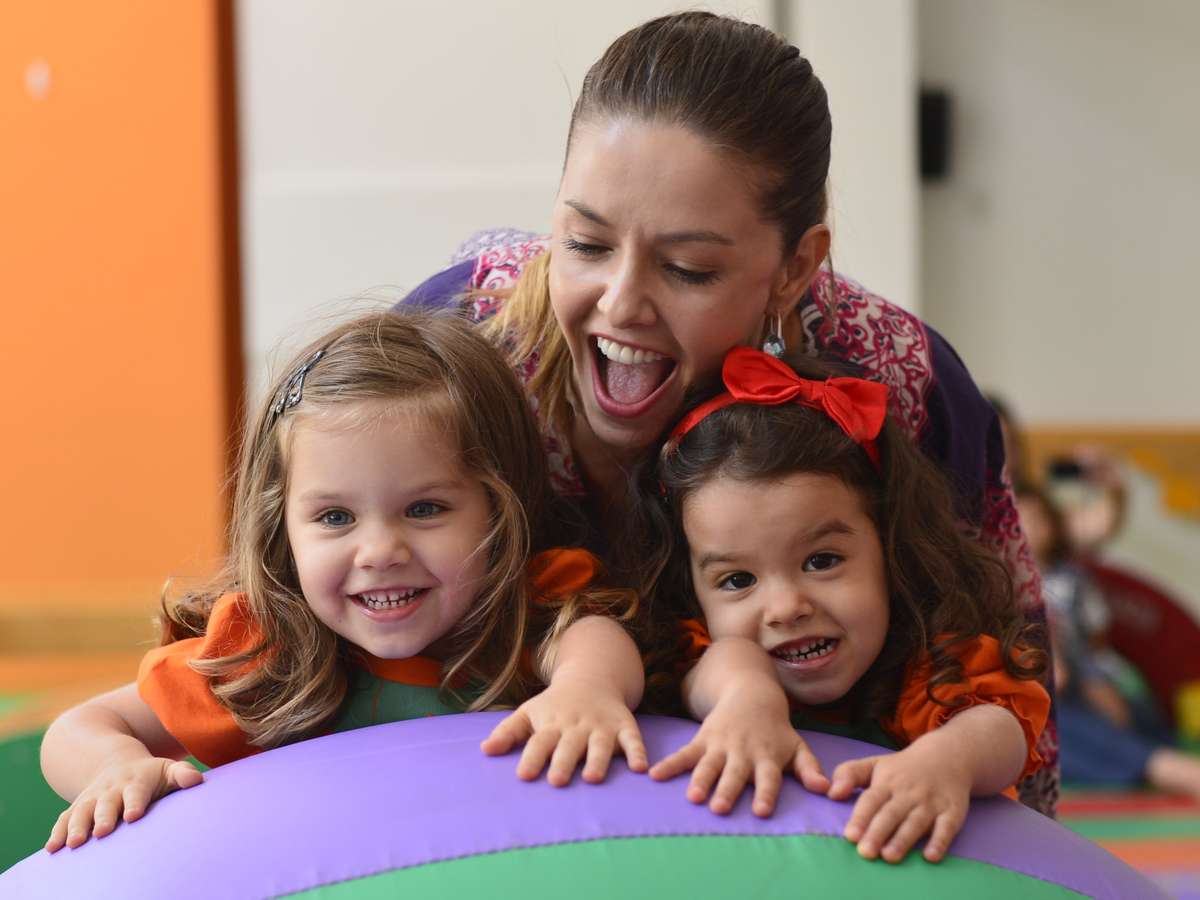 A atriz Bianca Rinaldi se diverte com as gêmeas em uma festa. Beatriz e Sofia, de 3 anos, estavam adorando a brincadeira.