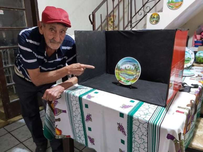 Silas Bento tem 84 anos e pinta paisagens em pratos de melanina ou em louças de cerâmica, que vendia por R$ 10,00 em Itaquera