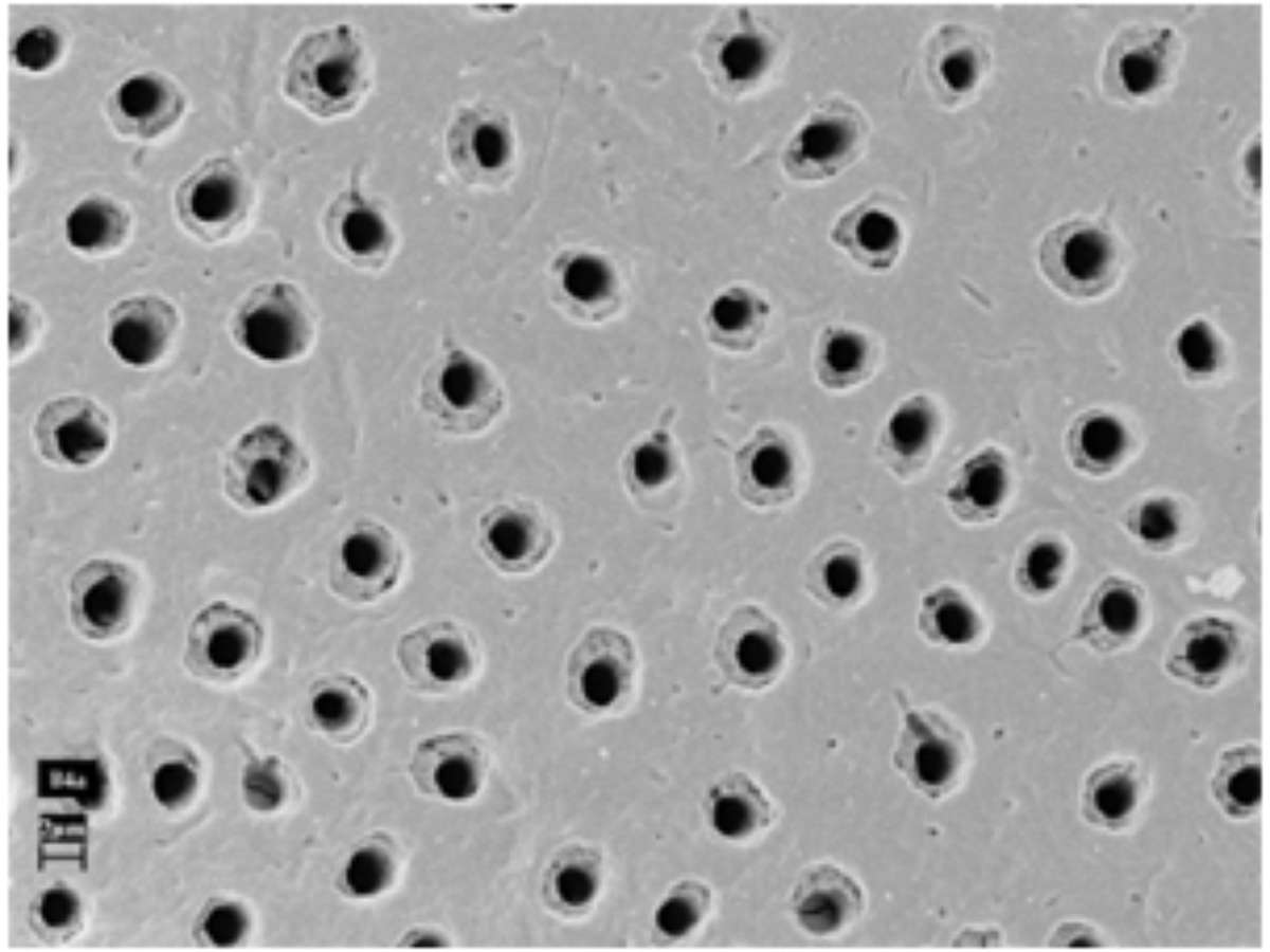 A dentina tem um grande número de poros ou tubos microscópicos (túbulos) que vão da face externa do dente até a polpa, no centro. Quando a dentina está exposta, esses túbulos podem ser estimulados por mudanças de temperatura ou certos alimentos. Abaixo está uma ilustração dos túbulos dentinários vistos em um microscópio: