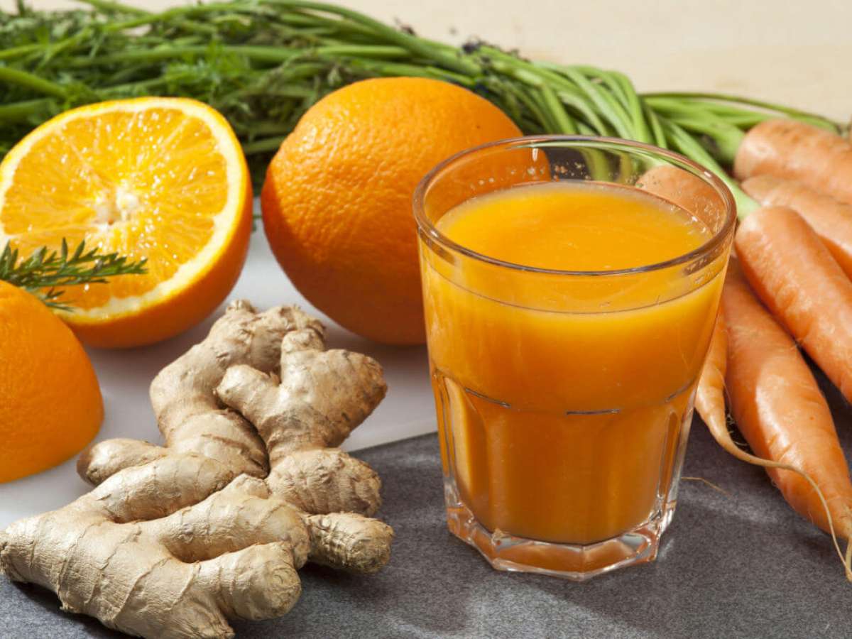 Descasque e corte a cenoura em rodelas. No liquidificador, bata a cenoura e a água até obter uma bebida homogênea. Em seguida, acrescente o suco de laranja, as fatias de gengibre e o gelo. Bata por 3 minutos. Coe o suco e sirva a seguir.