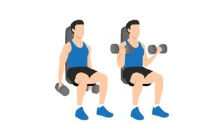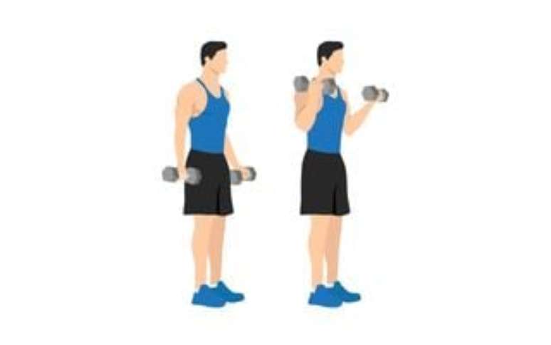A rosca direta com halteres é um dos exercícios mais recomendados e fáceis de realizar nessa idade. Ele trabalha a parte frontal do músculo e, caso o aumento de carga não seja possível, é possível compensar com mais repetições.