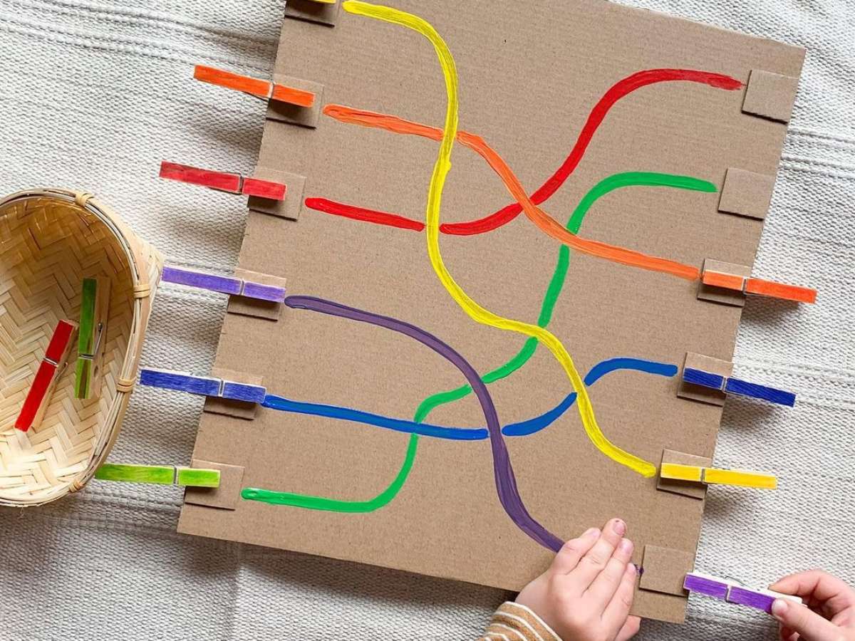 Ainda treinando a motricidade fina das crianças, este desafio começa com a criatividade dos pais em separar diferentes materiais para brincar de desenhar os caminhos e incentivar os pequenos a completá-los com os correspondentes.