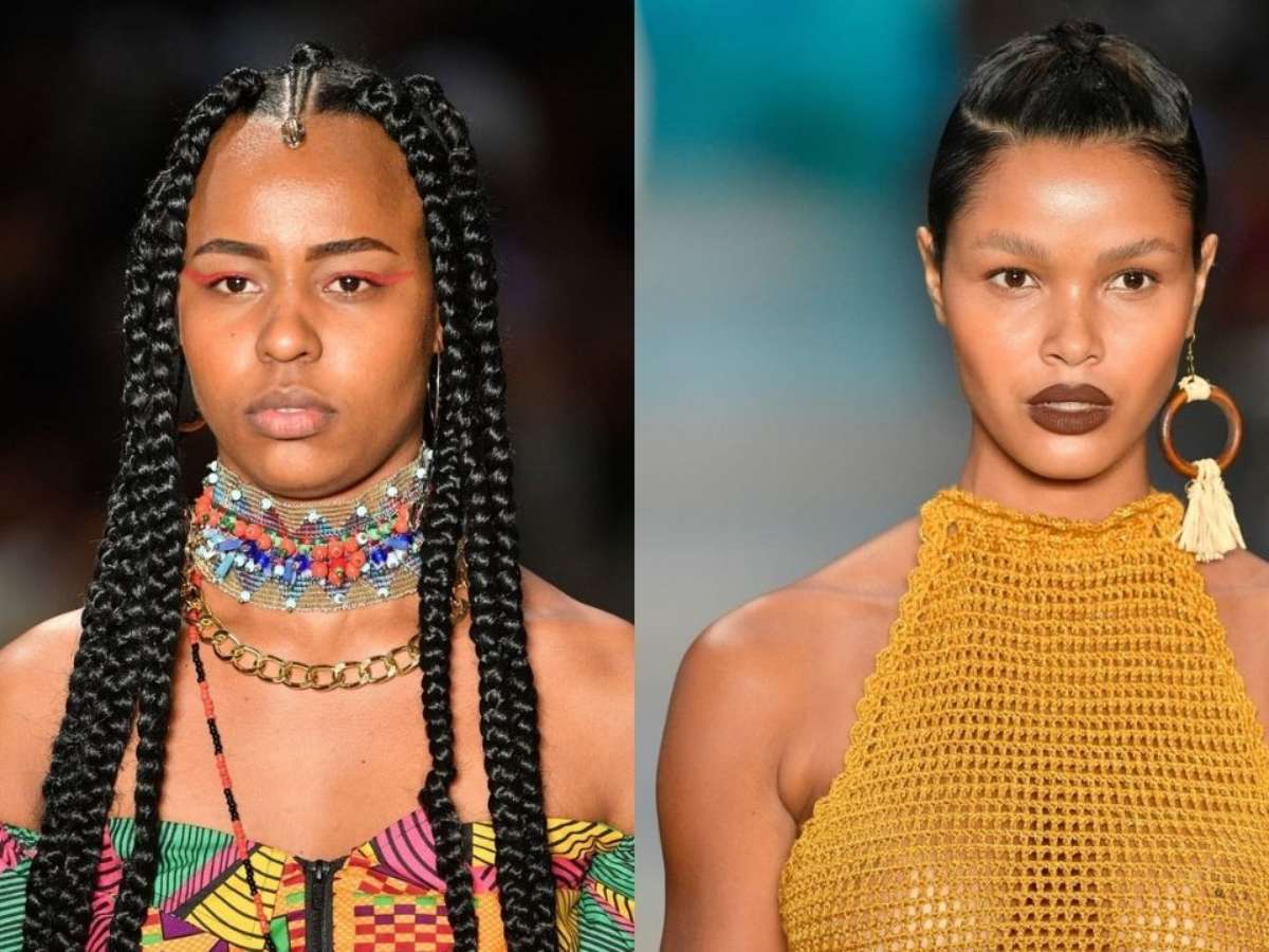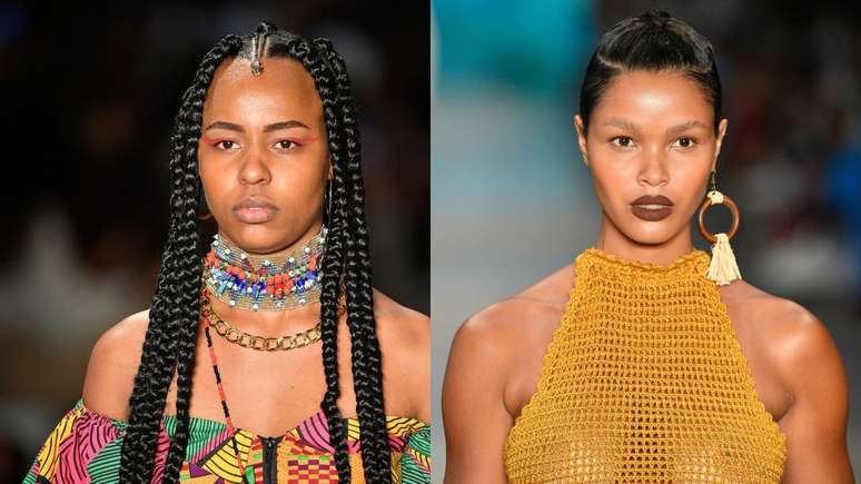 Al tendência agora é investir na boca marrom. Ateliê Mão de Mãe, marca do Projeto Sankofa, apostou na ancestralidade e diversidade desfilando presencialmente pela primeira vez no evento. Além do cabelo e da produção, os lábios marrons e com contorno marcado fez sucesso na passarela.