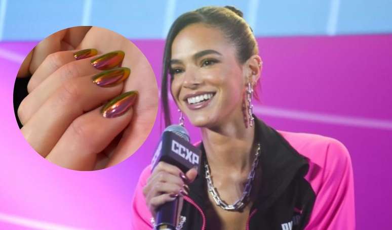 Diferentes versões unhas decoradas são uma verdadeira paixão nacional e Bruna Marquezine também está nesse time. Recentemente, a atriz surgiu com uma nova tendência: as sunset nails! O diferencial dessa unha decorada é associar o efeito espelhado com o brilho holográfico.