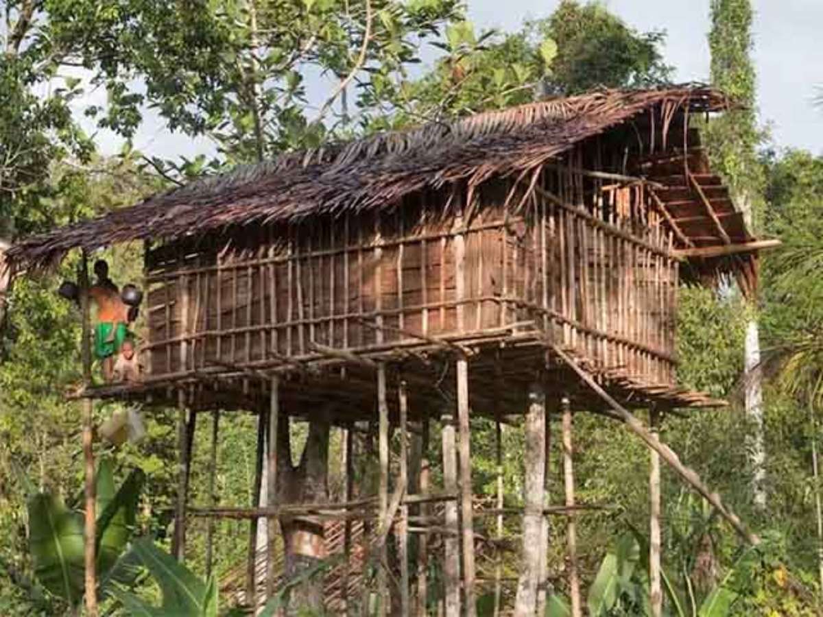 As casas são erguidas sobre uma árvore principal reforçada, usando plataformas de bambu amarradas com cipós e cobertas com folhas de palmeira.