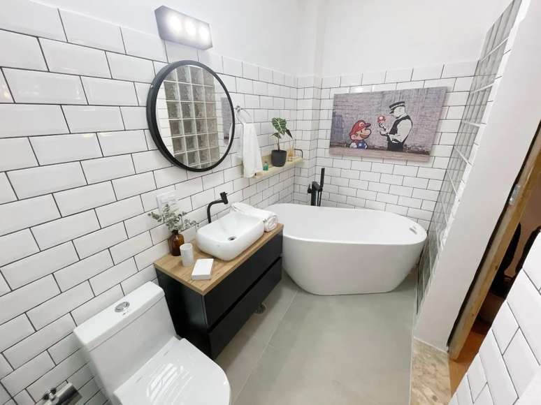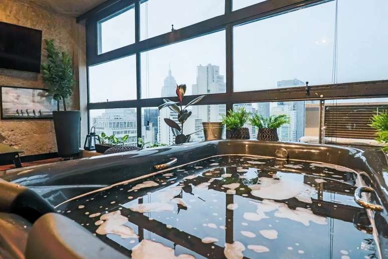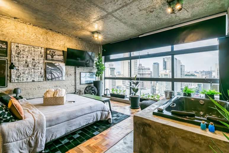 A decoração do apartamento é para quem gosta do estilo industrial: há parede de tijolos à mostra, teto de concreto, tubulações à vista, móveis de metal e muito tons de preto e cinza. Em um único ambiente fica a cozinha compacta, a mesa para refeições, o sofá de couro, a cama e o grande destaque do imóvel, que é uma banheira de hidromassagem para duas pessoas bem de frente para a janela, com vista matadora para o Farol Santander. Outras comodidades são a Smart TV e a Alexa integrada ao Spotify. Reserve aqui.