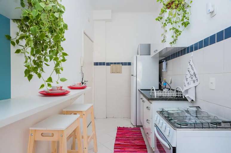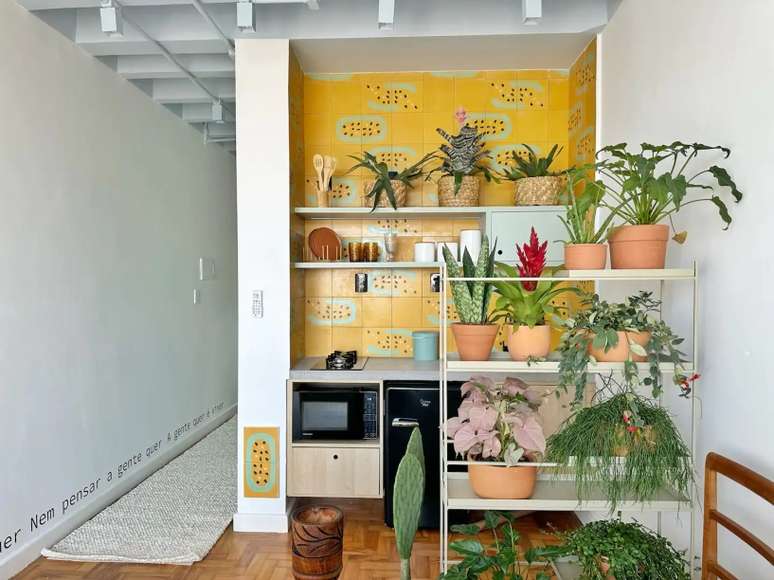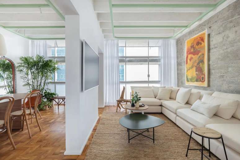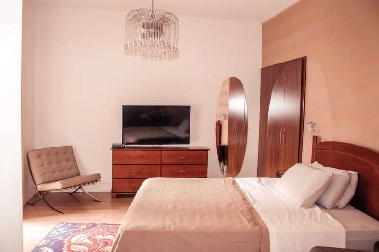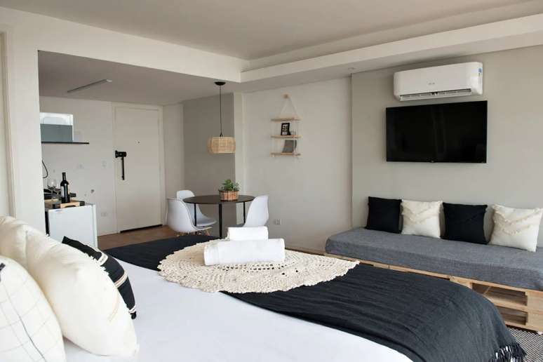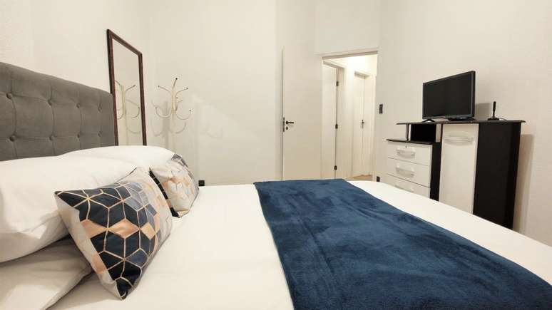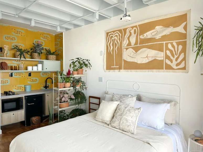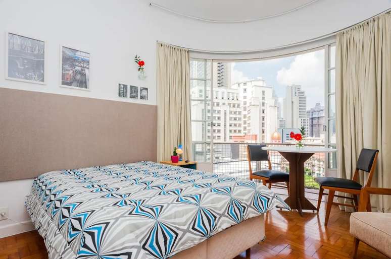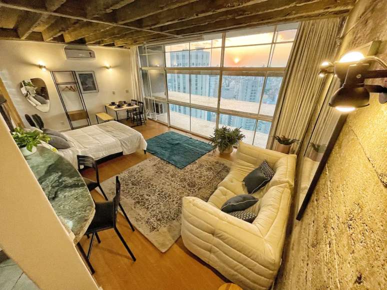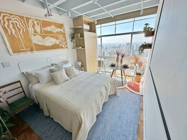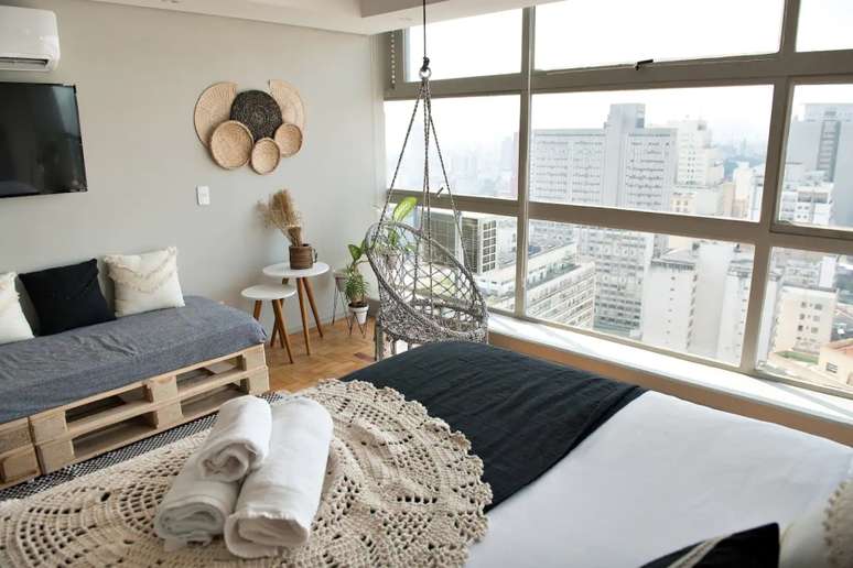 Do 33º andar do Mirante do Vale é possível avistar até a serra em dias de céu claro - visual valorizado pelo janelão que vai do chão ao teto. A decoração segue o estilo boho, com um balanço de macramê pendurado no teto e cestarias decorando as paredes. Além do banheiro, há um único cômodo que integra a cama, de frente para a televisão, e um sofá-cama. Tem ainda cozinha com micro-ondas, frigobar e uma pequena mesa com três cadeiras. Reserve aqui.