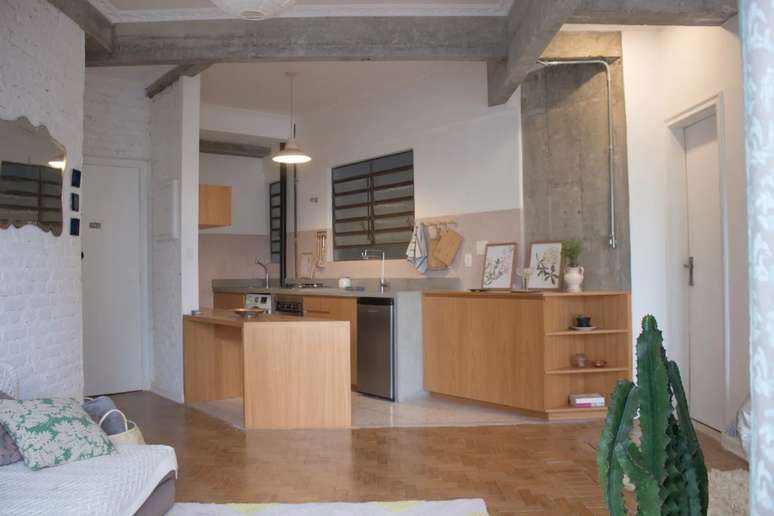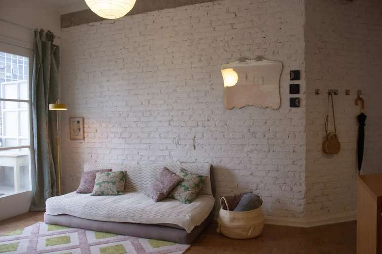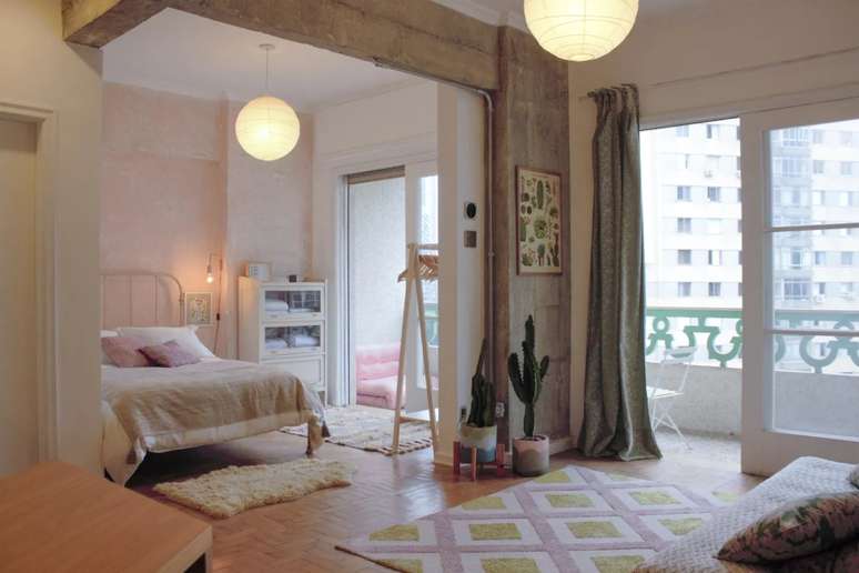 O delicado apartamento aposta em tons de rosa e azul-turquesa, tijolos pintados de branco, tapetes felpudos e quadros com estampas florais para compor uma decoração moderna e romântica. No espaço amplo e integrado há uma cozinha americana, um sofá-cama de futon e uma cama de casal. Para completar, há uma convidativa varanda com vista para outros prédios do Centro. Não há televisão. Reserve aqui.