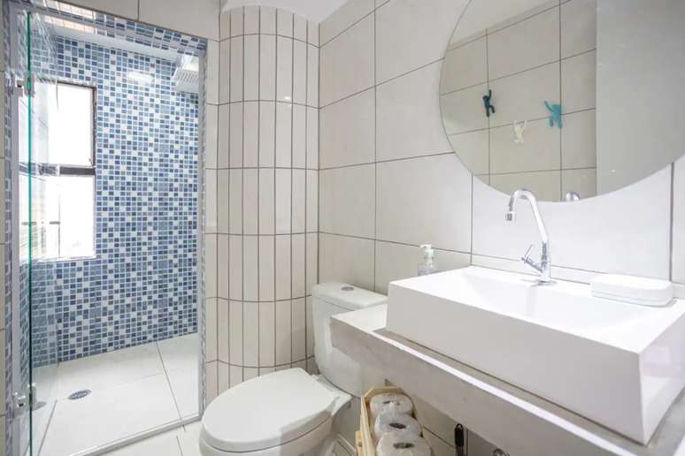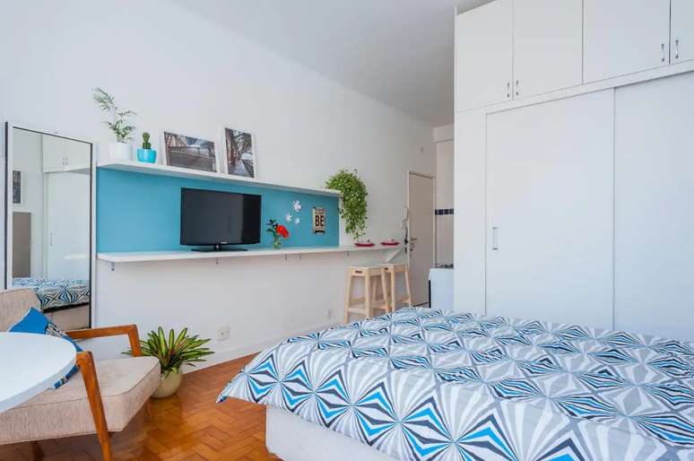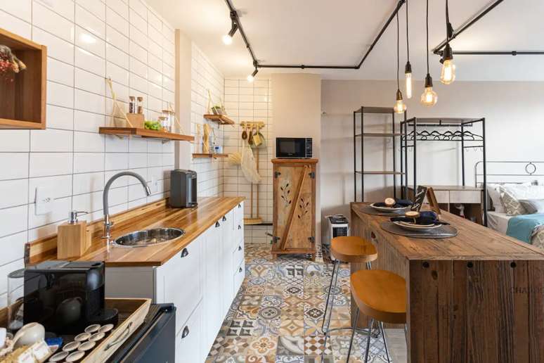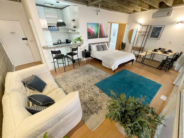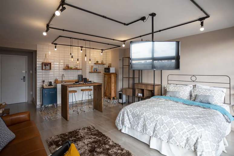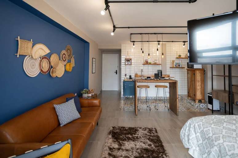 Ao entrar no loft, a primeira coisa que se vê é a pequena cozinha com um charmoso frigobar vintage, cafeteira Nespresso, balcão de madeira e que é demarcada por porcelanato no chão todo colorido e estampado. Mais adiante, uma parede azul-marinho emoldura o sofá de couro marrom, que fica de frente para a cama de casal. Presa a um suporte no teto, a televisão pode ser girada para assistir séries tanto no sofá quanto na cama. A vista da janela é para o