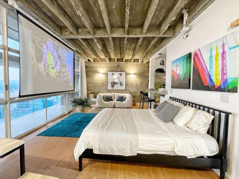 No andar mais alto do Copan, esse estúdio foi projetado pela arquiteta Yanaina Mella tendo como inspiração Gal Costa. Letras imortalizadas na voz da cantora foram pintadas acima do rodapé do quarto, como Barato Total, e em uma das paredes do banheiro - você pode cantar Baby enquanto estiver tomando banho ou atendendo aos chamados da natureza. E o tropicalismo também se faz presente nos diversos vasos de plantas. A lista de comodidades inclui uma seleção de livros de autores brasileiros, luzes controladas por comando de voz e um projetor de 100 polegadas. A cozinha é compacta e há uma pequena mesa para refeições ao lado do janelão com uma vista de arrancar o fôlego para o centrão. Reserve aqui.