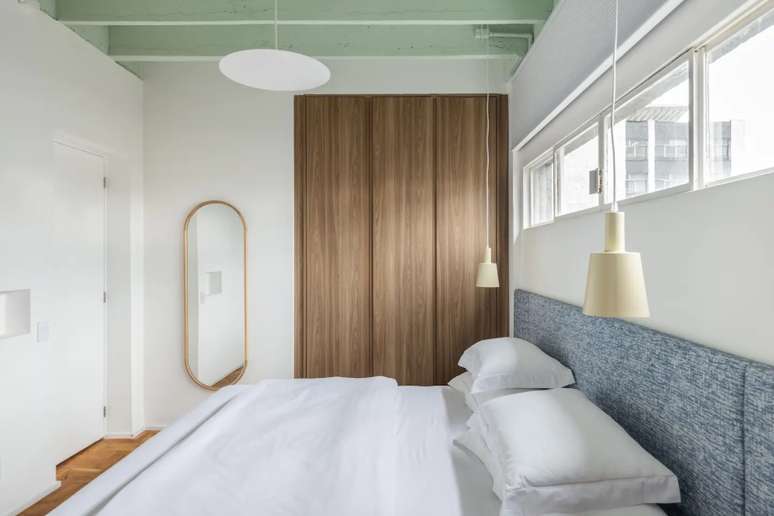 Um aramado pintado de vermelho faz as vezes de armário e integra os ambientes do estúdio estreito e comprido. A cama fica de frente para a janela e, logo atrás dela, há uma mesa para fazer as refeições e uma mini cozinha com pia, microondas, chaleira e frigobar. A surpresa é o banheiro aberto, com um chuveiro e uma banheira. Apenas a pia e o vaso sanitário ficam mais reservados, atrás de uma porta de vidro. A configuração da planta permite que, de qualquer lugar do estúdio, seja possível assistir a um filme ou série no projetor de 100 polegadas acoplado logo acima da janela. Reserve aqui.