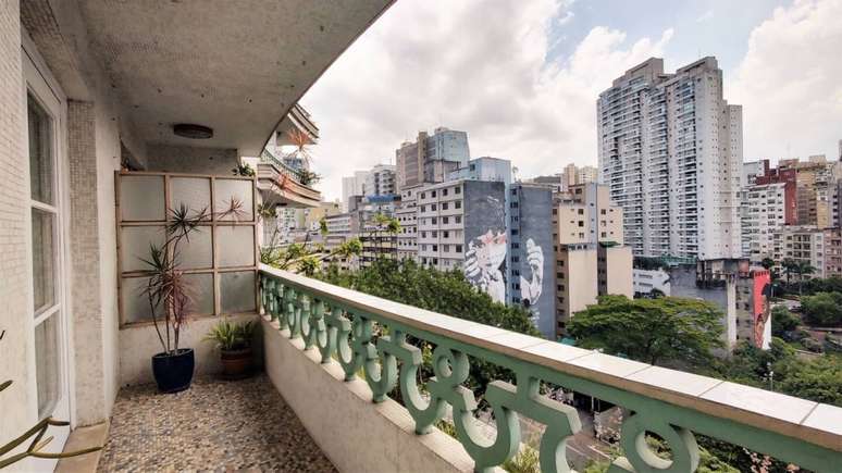 O pequeno apartamento possui em um mesmo cômodo cama de casal, bicama, mesa para refeições e uma cozinha compacta com geladeira, microondas, forno elétrico, cooktop de duas bocas e os utensílios básicos. O banheiro é todo de ladrilho verde. A porta balcão se abre para a pequena varanda com duas cadeiras de onde é possível ver o Farol Santander e o Edifício Martinelli. Reserve aqui.