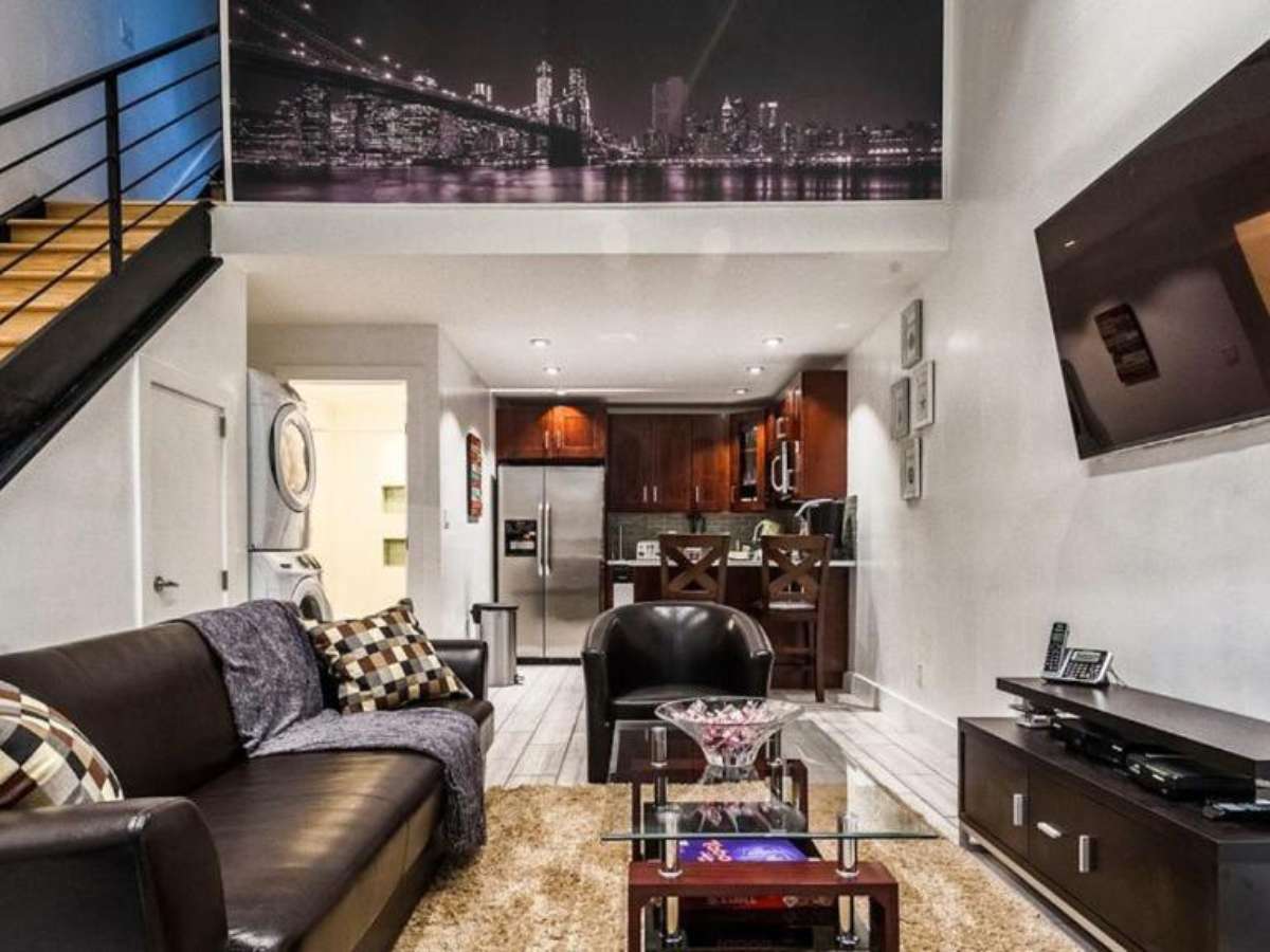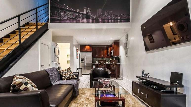 As paredes com tijolos aparentes dão um charme à decoração do apartamento duplex de 130m², que também tem revestimentos modernos nos dois banheiros. Apesar de possuir um único quarto, o imóvel acomoda até cinco pessoas: há uma cama de casal, uma de solteiro e um sofá-cama duplo. A sala de estar é decorada com uma foto do skyline de Nova York que cobre toda a parede. Na cozinha, há uma mesa para fazer as refeições. O apartamento fica no Brooklyn e a poucos passos de duas estações de trem, Seneca Avenue e Atlantic Avenue, mas, por outro lado, são comuns reclamações de barulho vindo da vizinhança . Faça sua reserva aqui.