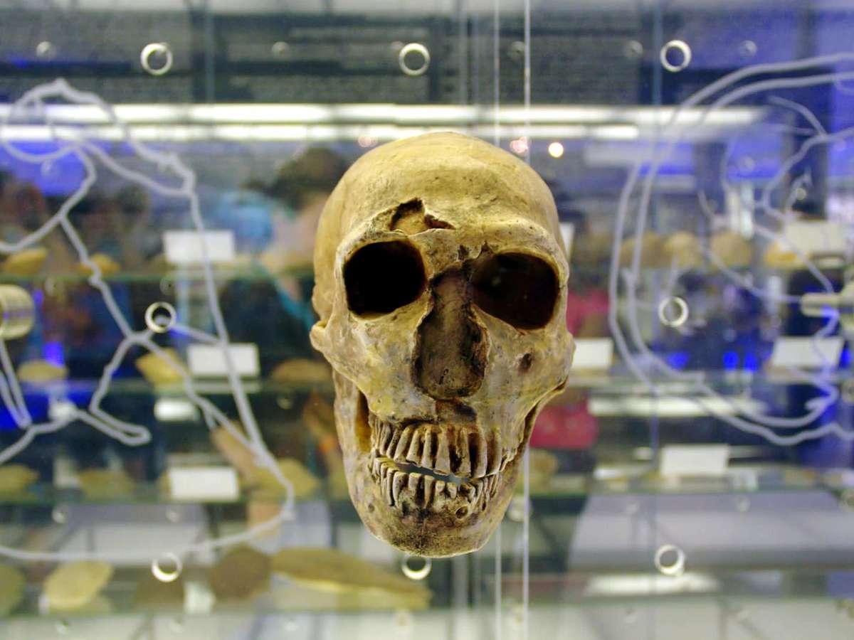 Na foto acima, por exemplo, é possível ver a réplica de um crânio de um Neanderthal, cujas características eram a testa larga, caixa craniana abobadada e nariz grande.