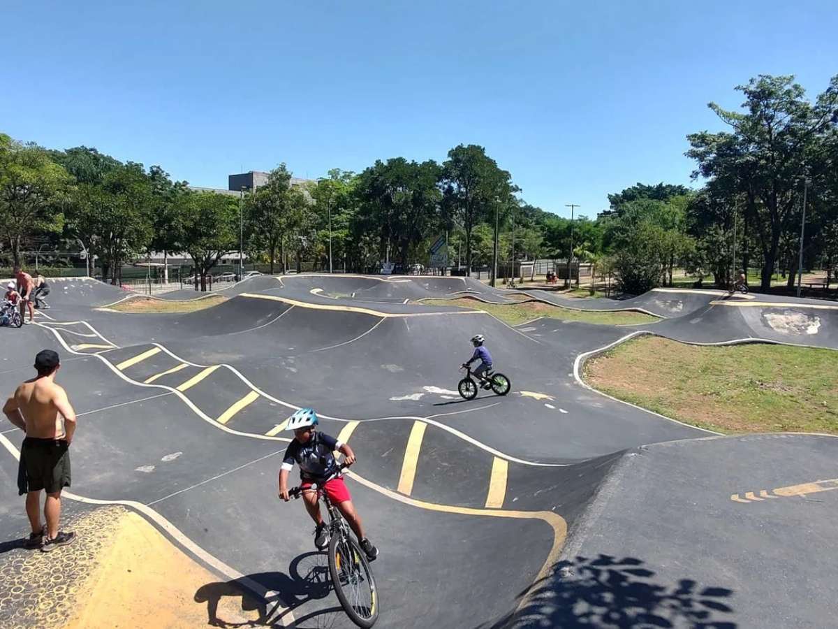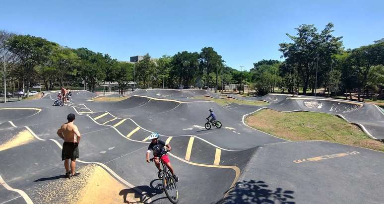 O espaço é conhecido pela pump track, um circuito de pista contínua com lombadas e curvas inclinadas para prática de bicicross.