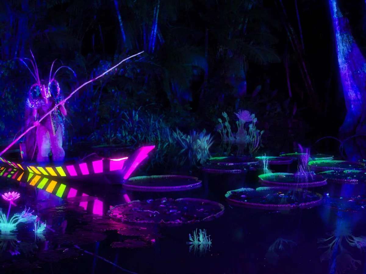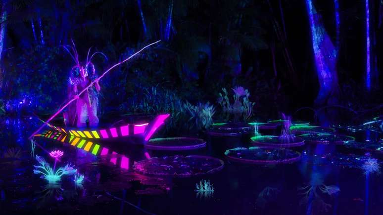 Um dos destaques é a barqueira que guia um conteúdo digital em 3D, projetado em uma das paredes do espaço em looping, conduzindo travessias por cidades-cardume, florestas biossintéticas, mercados de seca e chuva e aparelhagens robóticas - mundos que são ao mesmo tempo utópicos, distópicos e fantásticos.