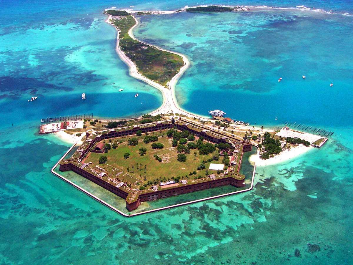 1 - Forte Jefferson - Construído a partir de 1846, o Forte Jefferson é um importante marco histórico dos Estados Unidos, especialmente por seu uso durante a Guerra Civil Norte-Americana, nos anos 1800. O local serviu como moradia para membros da União, ou seja, dos estados que não se rebelaram, além de prisão. Acessível apenas por barco ou avião aquático, é hoje um dos mais remotos parques nacionais do país.