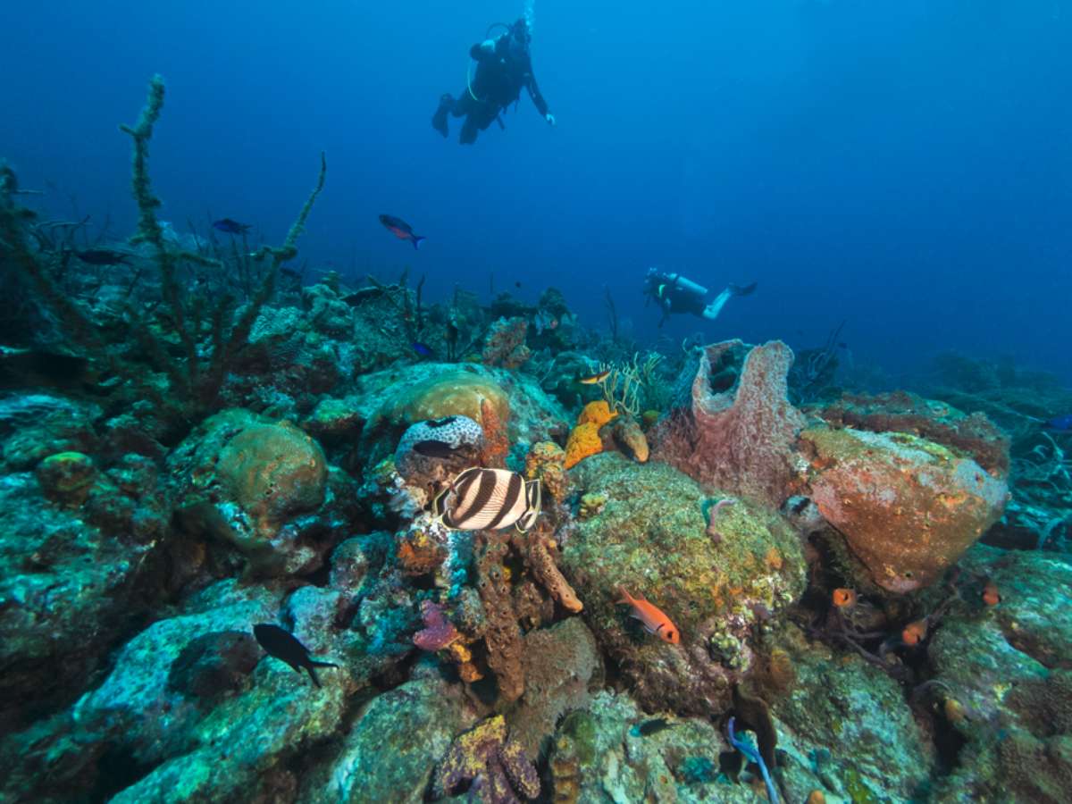 O que não faltam são opções para mergulhar em Barbados. A escolha depende do conhecimento e prática de quem vai e da disposição. Pode-se fazer mergulho com snorkel ou com cilindro. Alguns passeios levam os turistas para visitar navios naufragados, recifes de corais e até mesmo nadar com tartarugas. A área de Carlisle Bay é um dos pontos mais famosos entre os 34 existentes na ilha. Crédito: bcampbell65/Shutterstock