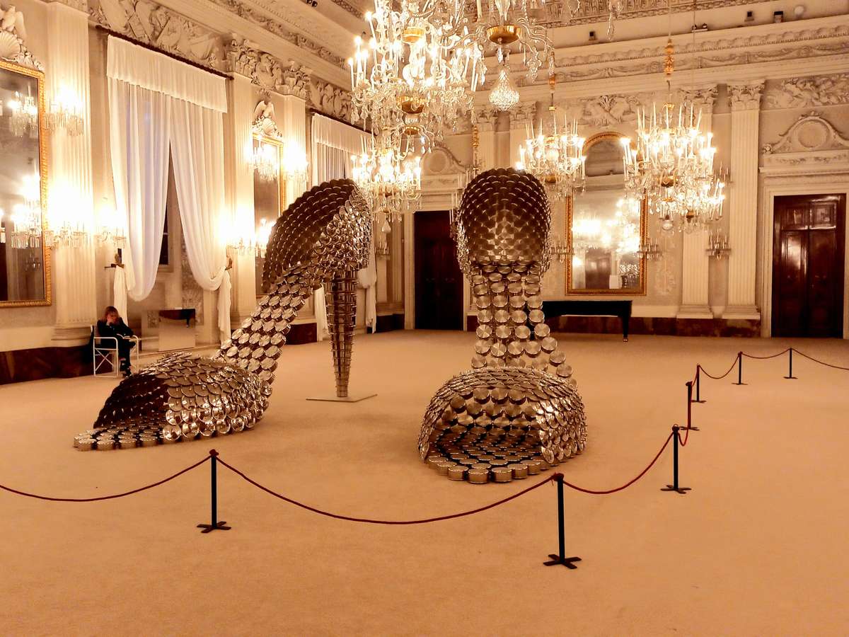 Para fechar, "Royal Valkyrie" é uma escultura impressionante que pende do teto da Tribuna da Galeria Uffizi. Um conjunto de vários materiais, como lã, penas, cordas e luzes de LED formam uma obra com várias cores. A artista faz referência ao mito de Valquíria e seu espírito guerreiro, através de suas proporções monumentais.