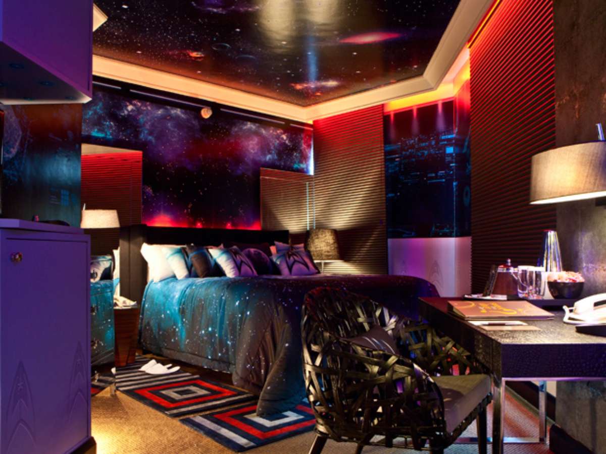 Os detalhes foram todos pensados para os "trekkers", fãs do filme. Os móveis são espelhados em aço escovado, a colcha da cama representa uma cena do infinito, pequenos objetos são caracteristícos de Star Trek