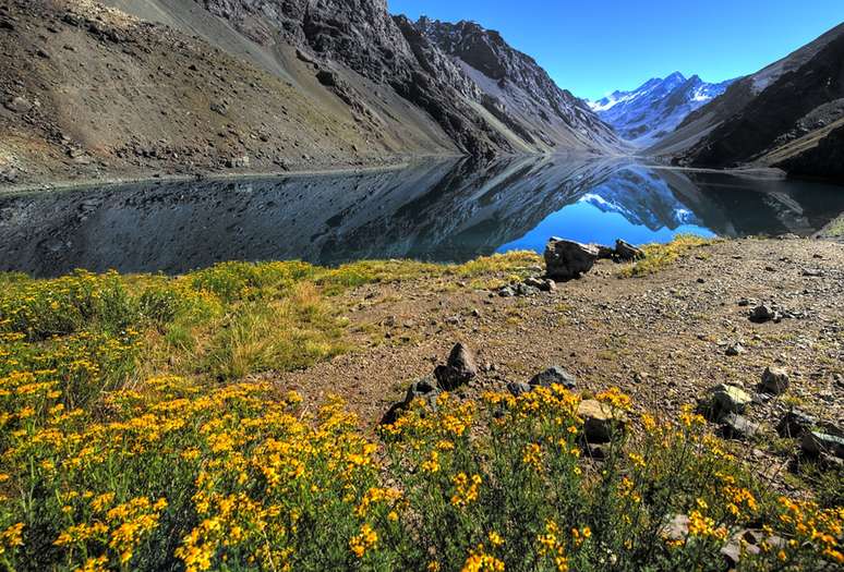 Primeiro ponto fotografado ao começar a viagem pelos Andes é antes da estrada Internacional passo Los Libertadores, também chamada de Cristo Redentor. No outono não há neve e o reflexo da paisagem na Laguna del Inca vale a pena