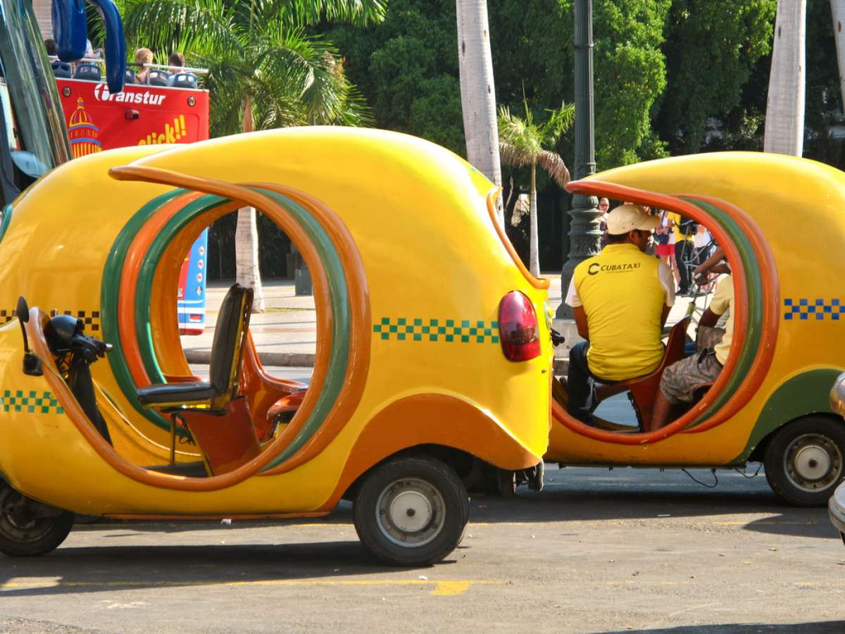 La Havana, Cuba: uma das características mais marcantes da capital cubana é a grande presença de veículos diferentes em suas ruas. Além de automóveis dos anos 50, tuk-tuks amarelos com uma forma curiosa - conhecidos como Coco-Taxi - fazem o transporte dos passageiros
