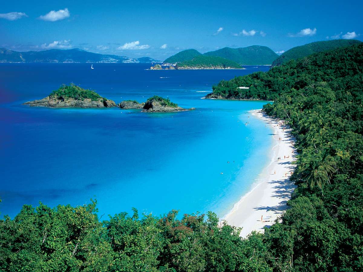 Trunk Bay, Ilhas Virgens Americanas - Situada dentro do Parque Nacional das Ilhas Virgens, Trunk Bay é uma das mais mais belas praias do Caribe. Com areias brancas cercadas de uma densa vegetação, esta praia das Ilhas Virgens Americanas tem águas calmas ideais para mergulhar entre peixes e corais coloridos