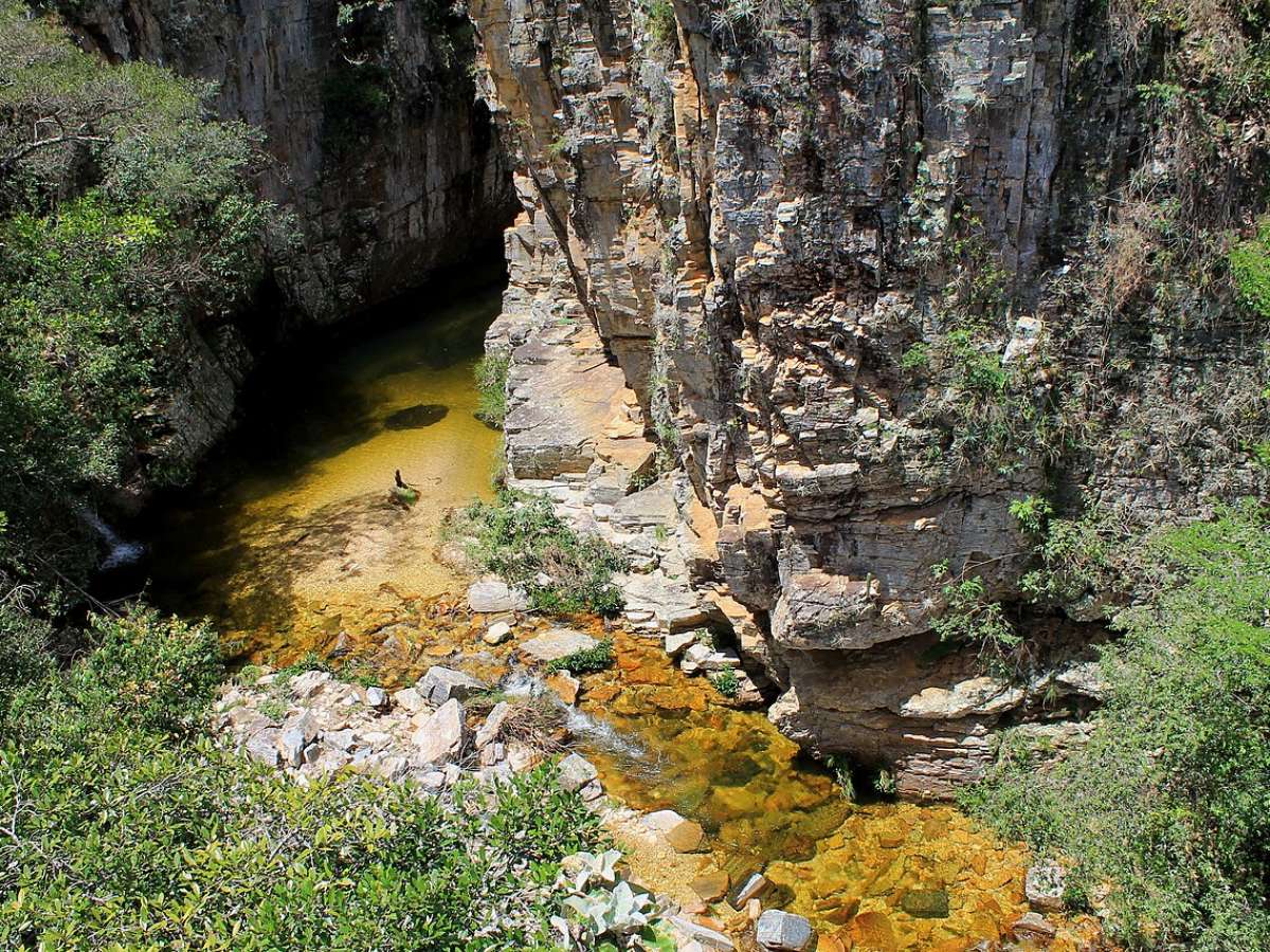 Uma das curiosidades da Trilha do Sol em Capitólio é a coloração da água em alguns trechos, puxando para tons esverdeados ou amarelados, dependendo da incidência de luz e da composição mineral das rochas. No Poço Dourado, por exemplo, essa tonalidade ganha destaque, principalmente em horários de sol mais alto, que intensificam o brilho sobre a superfície.