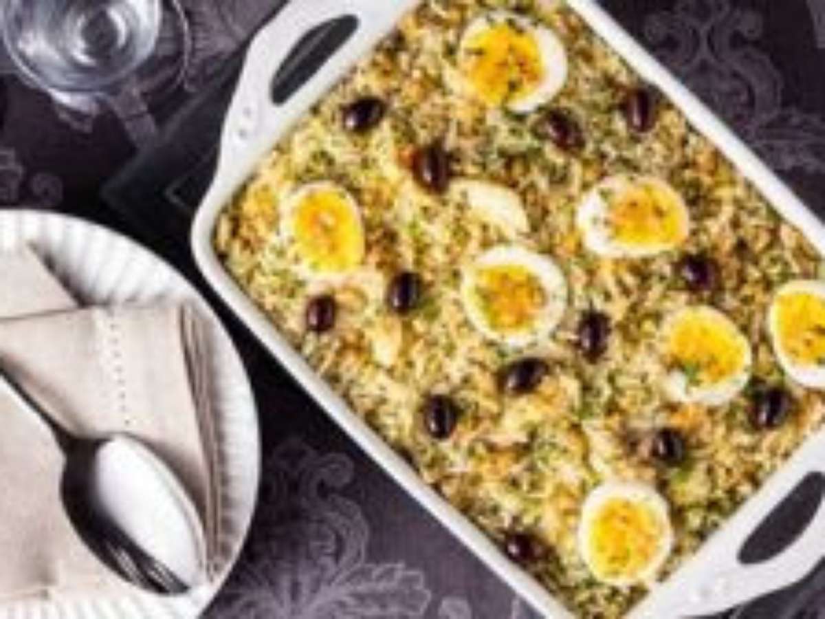 Prepare o arroz de acordo com as instruções da embalagem, deixe esfriar e reserve. Em uma frigideira, aqueça o azeite e doure a cebola. Logo em seguida, junte o bacalhau e tempere com a pimenta. Caso necessário, adicione sal a gosto. Em uma tigela misture: o arroz, o bacalhau, 100 g de nozes, o parmesão, a salsa picada e por último a nata. Coloque em um refratário. Por cima, disponha as rodelas de ovo, as azeitonas e o restante das nozes. Regue com azeite e leve ao forno preaquecido a 200° C até aquecer.