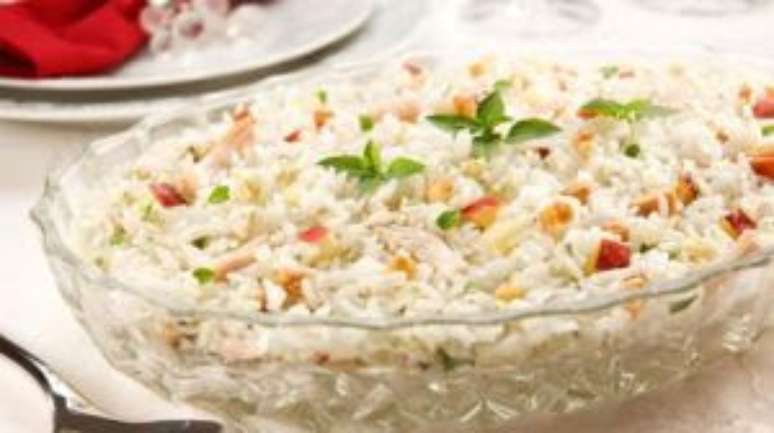 Transfira a metade do arroz para uma travessa grande, espalhe o recheio de peru e maçãs e finalize com a outra metade do arroz. Decore com algumas fatias de maçã, nozes inteiras e folhas de manjericão. Sirva em seguida, acompanhando tender ou lombo assado.