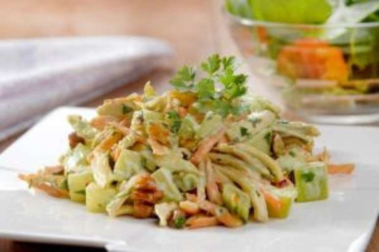 Salpicão: corte a maçã em pedaços pequenos e misture com o frango, o salsão, as uvas-passas e a cenoura. Junte a maionese, misture bem e tempere com as raspas da casca do limão, a pimenta, a salsinha picada e a mostarda. Utilize sal a gosto. Por último, polvilhe as nozes. Sirva gelado.
