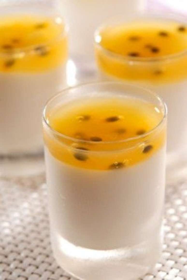 Distribua o manjar em potinhos e despeje por cima a calda de maracujá. Deixe na geladeira até o momento de servir.