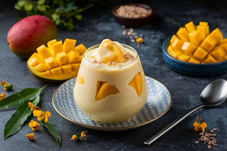 Em copos, coloque cubos de manga e distribua o creme. Leve à geladeira por, no mínimo, 3 horas, ou até que a sobremesa esteja firme e bem gelada. Sirva em seguida.