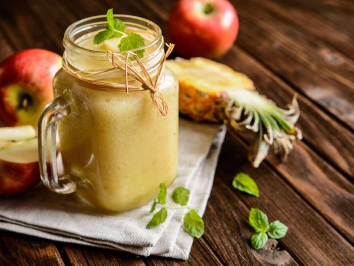 Descasque a maçã, retire as sementes e pique-a em pedaços pequenos. Corte as fatias de abacaxi em pedaços pequenos. No liquidificador, bata a maçã, o abacaxi, o leite de aveia e o gelo até obter uma bebida homogênea. Enfeite a vitamina com as folhas de hortelã e sirva em seguida.