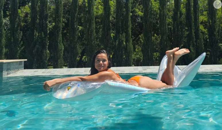 Nesta segunda-feira (08), Maisa parece ter se dado o privilégio de renovar o bronze e curtir um banho de piscina bastante caloroso. A famosa, que recentemente surgiu aos beijos com João Guilherme, elegeu um biquíni laranja para a ocasião.