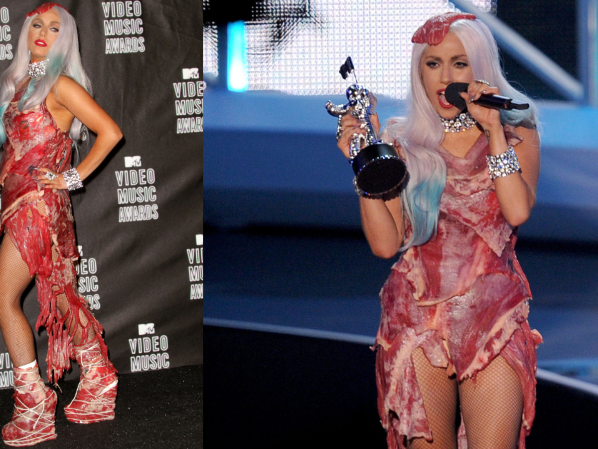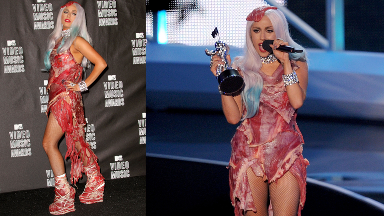 Criado por Franc Fernandez com carne crua de verdade, o vestido gerou uma grande repercussão no tapete vermelho. Mais tarde, em entrevista a Ellen DeGeneres, Gaga explicou que a peça não tinha a intenção de ofender veganos ou vegetarianos, mas possuía múltiplas interpretações.
