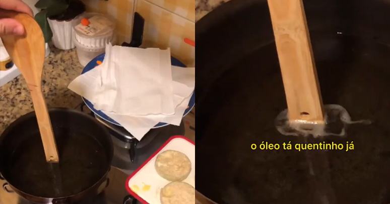 Ainda antes de empanar, checamos se o óleo estava bem quente e pronto para fritar. Fizemos o teste do óleo usando a técnica da colher de pau.