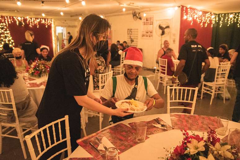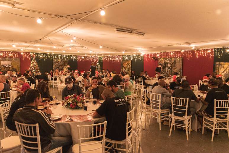 É noite de terça-feira (14/12) do último mês do inacabável ano de 2021. Embaixo do viaduto que separa os bairros da Liberdade e Bela Vista, na região central da cidade de São Paulo, é servida uma ceia com fartura de alimentos, decoração natalina e os convidados do banquete são servidos em suas mesas.