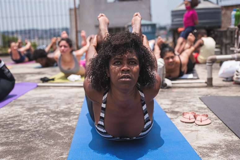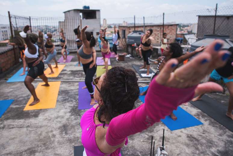 “Sophia, como é que faz mesmo?”, perguntava uma das alunas sob um sol que marcava os 26 graus, por volta das 11h35 de um domingo. Ao fundo, a maioria dos carros que passavam pela rua tocavam um funk estralando. Na laje cedida pela associação Periferia Ativa, na rua Adoasto de Godói, na região do Capão Redondo, zona sul da capital paulista, as que chegavam atrasadas com seus tapetes de ioga coloridos recebiam a bronca em tom de brincadeira: “olha aí!”. E arrumavam espaço entre as colegas. Das sete que estavam no início, a aula dobrou para 14. Os comandos da atriz e professora Sophia Bisilliat, de 58 anos, que orientava os movimentos, às vezes se misturava com as músicas de Simone e Simaria que tocavam na casa vizinha, enquanto levantava para corrigir as posições das demais. “Puxa a mão esquerda por trás das costas, com peito aberto, vamos, vocês conseguem!”, estimulava.