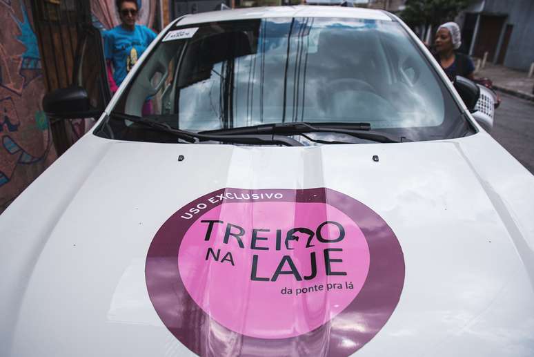 Na logomarca rosa, estampada no carro, bem abaixo de Treino na Laje, está escrito “da ponte pra lá”, uma referência à música “Da Ponte Pra Cá”, dos Racionais MCs, que tem como pano de fundo a Ponte João Dias. Em frente à laje da Godói e em ruas adjacentes não faltam grafites com os rostos e letras dos integrantes do grupo de rap. “Ali já pela marginal, você já enxerga prédios espelhados, parecendo Dubai, uma realidade completamente diferente das periferias e de onde nosso trabalho alcança”, explica Sophia. “Aqui, as casas ainda são um pouco mais estruturadas, mas tem lugares onde são de madeira, de lona”.