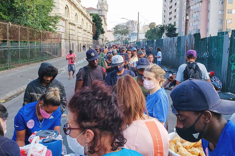 Ali, a equipe montou uma mesa de plástico e começou a organizar os alimentos. “Pode chamar o pessoal, tia?”, perguntou um rapaz que estava próximo dos veículos. “Olha a doação”, avisou. Na Praça Júlio Prestes, onde fica a Sala São Paulo, acontecia a entrega de uma premiação aos bolsistas da Orquestra Jovem do Estado, corpo artístico da Secretaria de Cultura e Economia Criativa do Estado de São Paulo.